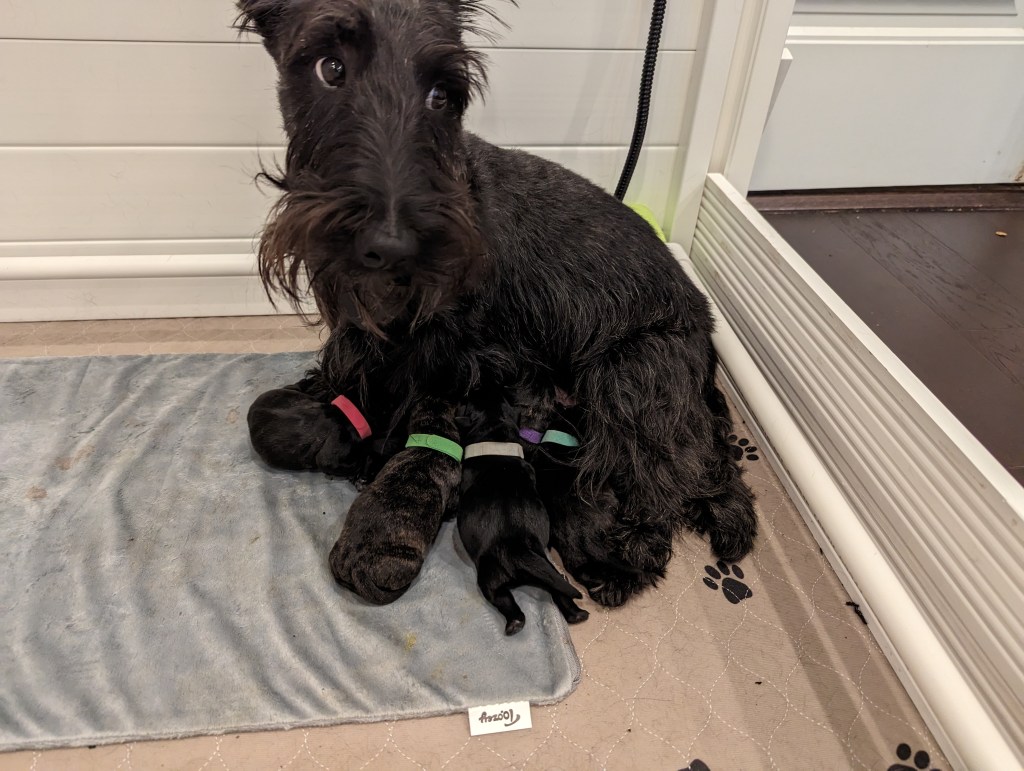 We have been eagerly awaiting our next litter of Scottie puppies for quite awhile now. It’s been two full years since we last raised a litter and we’re very, very excited to have pups in the whelping box again.