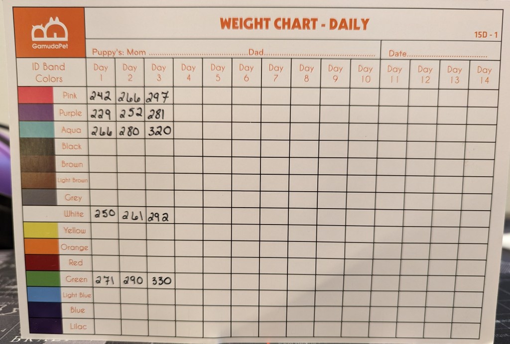 The good news is that her pups are thriving under her care. Their weights are steadily climbing. The goal is to gain 10% of their body weight per day after the second day and we’re not far off from that. We’ll continue to keep an eye on all of them to ensure no pup is falling behind the curve.