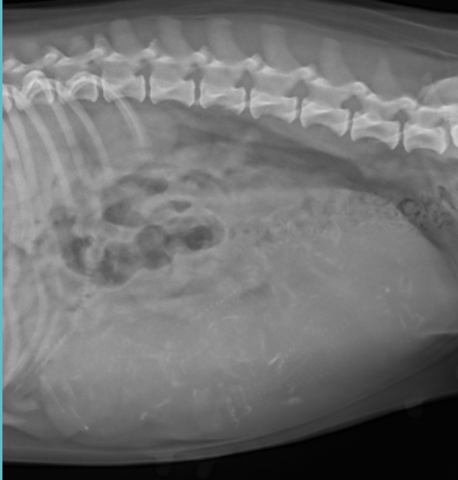 Fortunately, that’s not the case with Skye. Her imaging looked great. Her puppies’ skeletons are still calcifying so you’ll have to squint a bit, but see if you can spot them all.