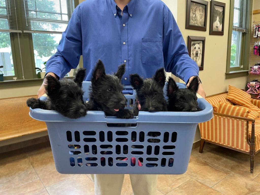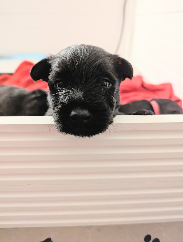Initially, all of these pups were spoken for but several individuals on the wait-list have chosen to pass for various reasons. Due to this, we do have two puppies currently available – one girl and one boy, both black. This is subject to change, so check in with us via email at dupplinscotties@gmail.com or Facebook message to see if this is still the case at the time of reading.