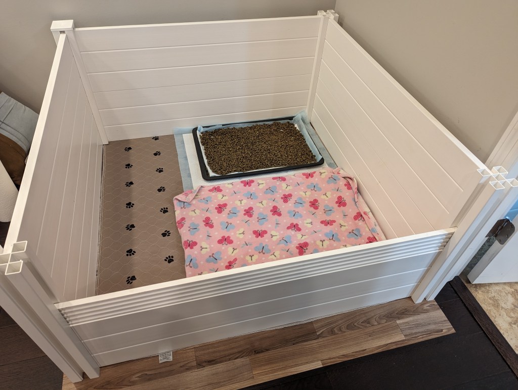 This pen housed a total of five nine week old puppies from about 0800 to 1500. Aside from a few displaced pellets and some wonky underpads, there’s zero mess to speak of at all!