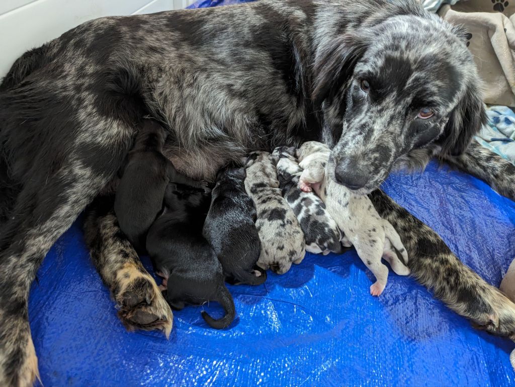 Six little ones, four boys and two girls, were born on April 16th in the early afternoon. All are black aside from one little brindle lad in the orange whelping collar. As always, Skye did absolutely amazing and has been a very attentive mama. She’s extremely protective of her littles at first, so we’ve been giving her some space. We’ll get individual pictures later when she’s not so stressed out by people messing with her babies. Images are sparse due to this, but I do have a few to share!