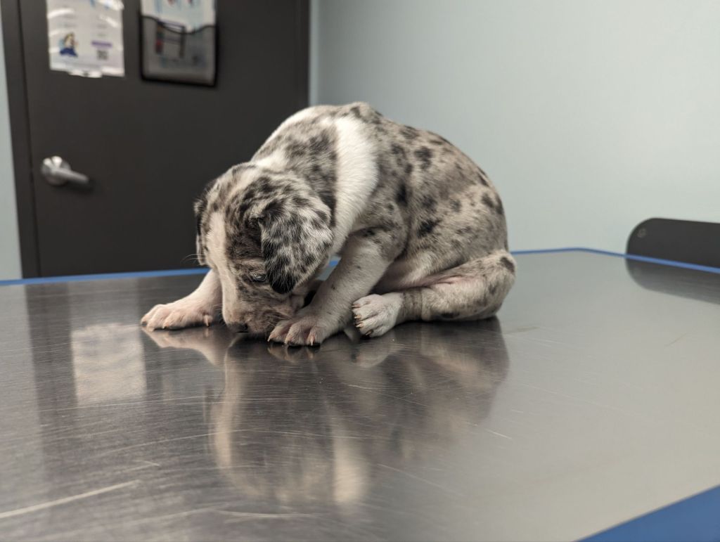 I rushed her to the vet as well. Despite being wormed on a regular schedule, she was infested with an overwhelming amount of roundworms. The whole litter was placed on a potent antiparasitic medication and Layla also received steroids, subq fluids, and antibiotics. At seven weeks of age, her chances of survival were much better than Haley’s. Happily, she did pull through!