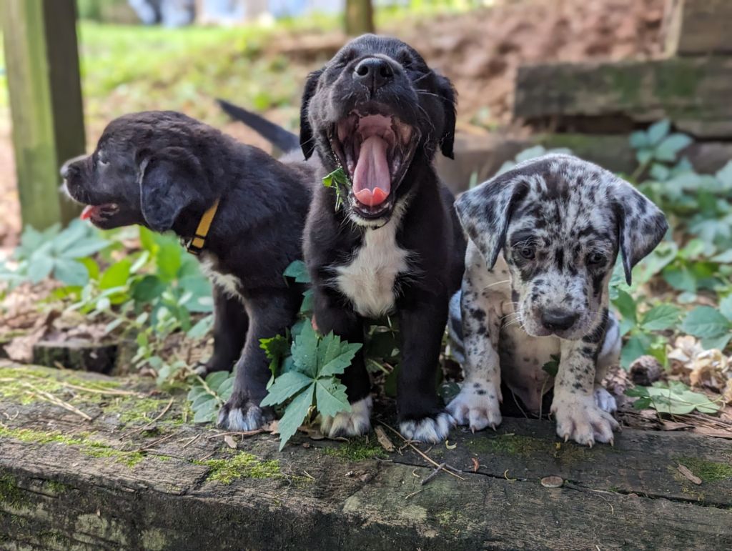 The little pink collared girl is minimal brindle with a light dusting of silver. The white collared boy is the only jet black puppy of this litter. The others are a range of beautiful golden brindle that will probably lighten up to silver as they age.