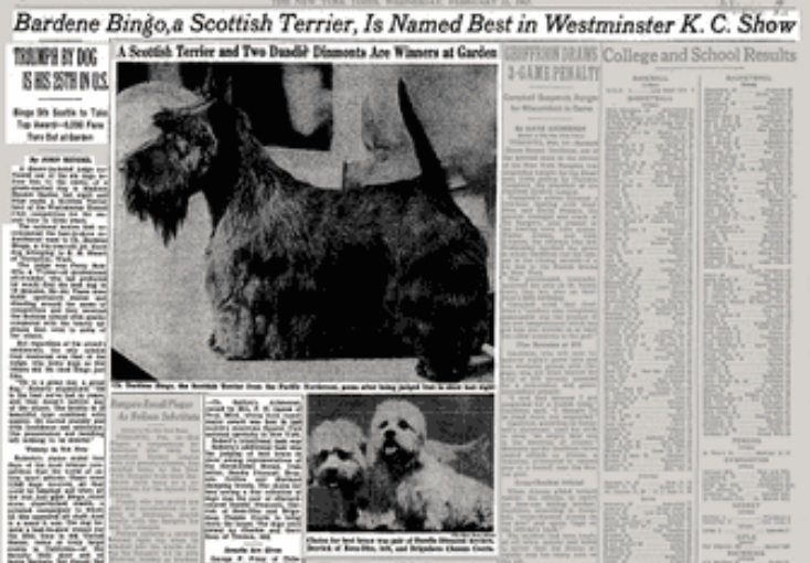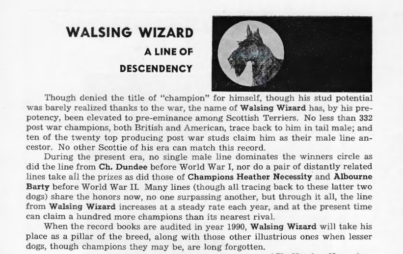 Bardene’s Bingo took the show dog world by storm in 1967 by becoming only the third Scottish Terrier to win at Westminster. He was widely bred and, more importantly, his pups were widely linebred. This is the practice of breeding related dogs (sometimes even as closely related as mother to son or father to daughter) in order to “set” a particular desirable trait in the line. Most traits that breeders select for, such as desirable ear set or correct body shape, are recessive in nature. Keeping the line “tight” amplifies the genes that produce these traits, but it also has the possibility of eliminating genetic variability.