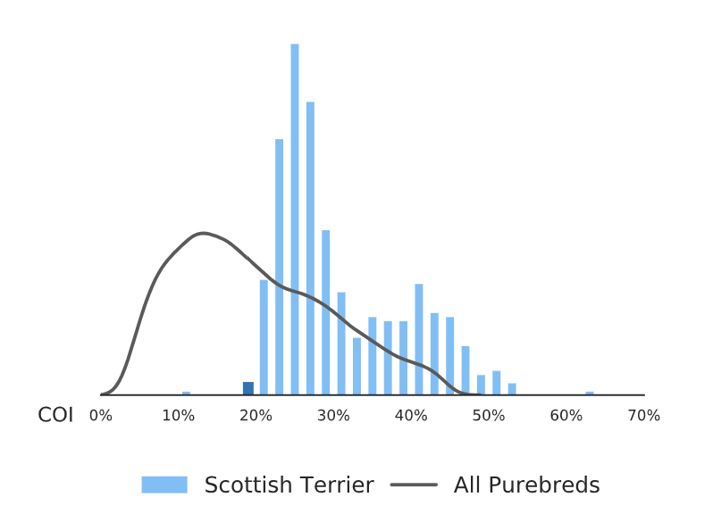 Embark, a popular genetic service available to breeders and pet owners, calculates the COI or “coefficient of inbreeding” of their received specimens. The grey line is the average COI of all purebred breeds, and the mean appears to be about 12-14%, give or take. Compare that to the blue bars, which represent Scottish Terriers. The mean here appears to be in the high 30s, at least visually. Goal COI for a healthy breeding population is often quoted as being 6%, but certainly no more than 15%.