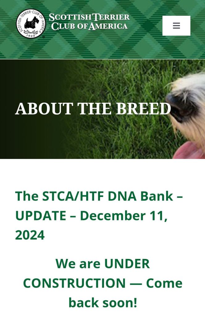 There is zero reason that a similar program could not be adopted for the Scottish Terrier. None whatsoever. The carrier genes of the conditions that plague our breed have not all been identified. I’m confident that they will, almost exclusively because of the work that you and [redacted] have put into the Scottie DNA bank. You’re both the biggest contributors to saving our breed, bar none. What you guys have pulled off is nothing short of remarkable, and I deeply thank you for doing what you have done and thank you in advance for what you will continue to do for our breed.