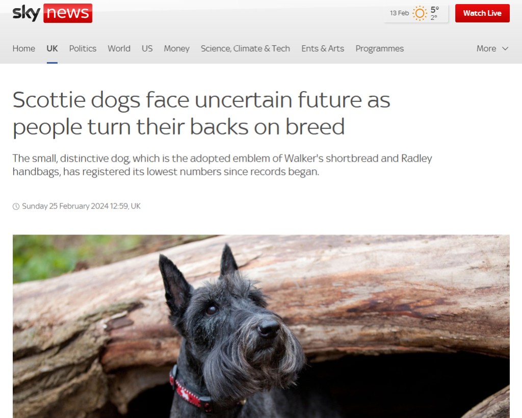 This continued on for years, even as Scotties became scarcer and scarcer. Their numbers fell precipitously in the 80s and 90s, to the point that breed clubs sounded the alarm about the possibility of detrimental health effects, and possibly even the extinction of the breed altogether. By the mid 2010s, they had been placed on the endangered breed registry in the UK. Registered litters have experienced a small bump in the last ten years or so, but not as much as we stewards would like to see…especially in their ancestral homeland.