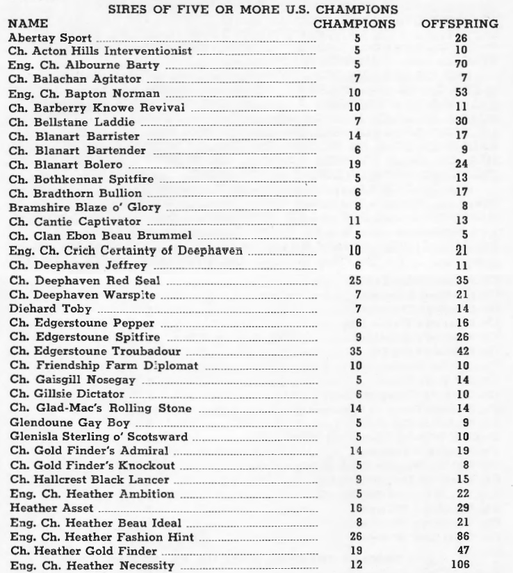 There were hundreds of dogs that produced 30, 40, even over 100 puppies. The most popular sires produced over 300, possibly as high as 500 puppies in their lifetimes. And these pups were subsequently bred back to each other over and over again in order to produce more champions. In fact, it became a point of intense pride to own a “double grandson” of many of these below names.