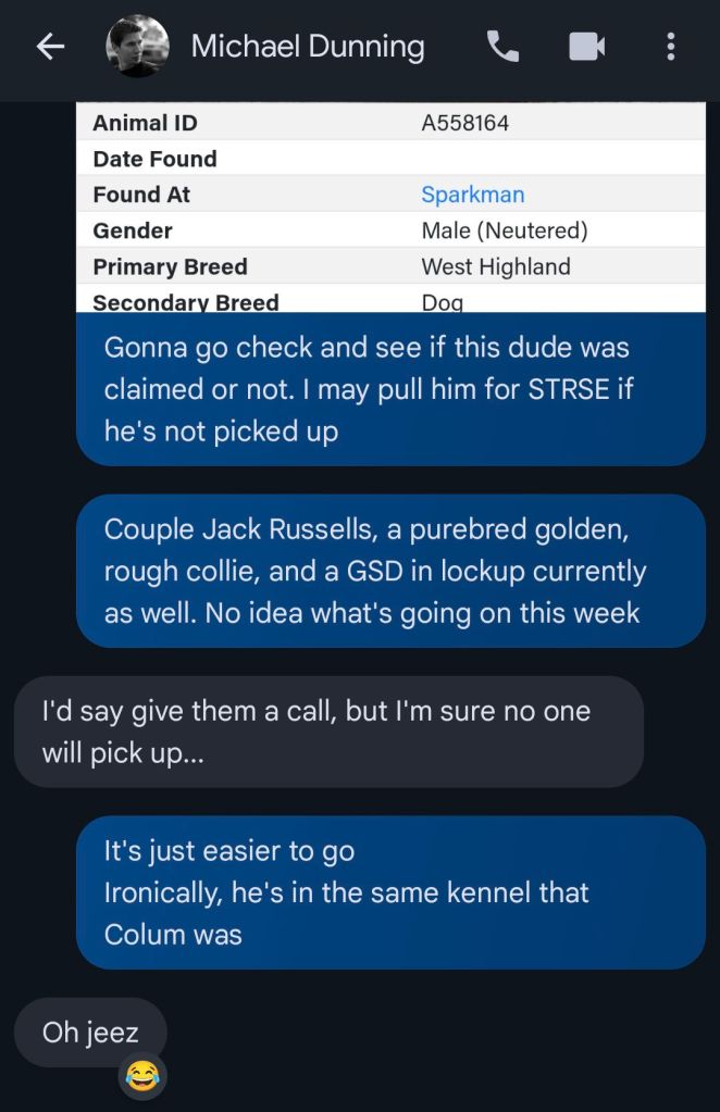 I’m not. I mean…I’d pulled him under Brindlee Mountain Animal Rescue just to circumvent having to pay the fee to spring him out of doggie jail, but his care, costs, and adoption process were totally on me. They asked me how often I do this sort of thing. I replied that I do it whenever the need arises. That answer didn’t seem to be quite what they were expecting, but it’s the truth. They couldn’t accept not paying an adoption fee, so they made a generous and very appreciated donation to BMAR instead.