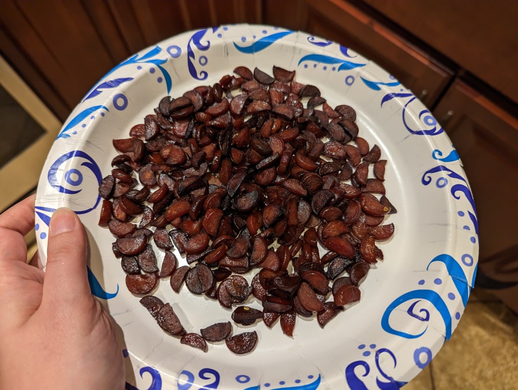 From here, you can pick whatever method you like the most. If you own a dehydrator, use it. If not, you can line a plate with a paper towel, dump the pieces on top, and pop them in the microwave for about five minutes on high. They’ll still be spongy feeling when done, but they’ll firm up as they cool. This can result in some burning, though. My dogs don’t seem to mind, but I’m not a fan of the smell it creates. So, I usually dry mine in the oven.